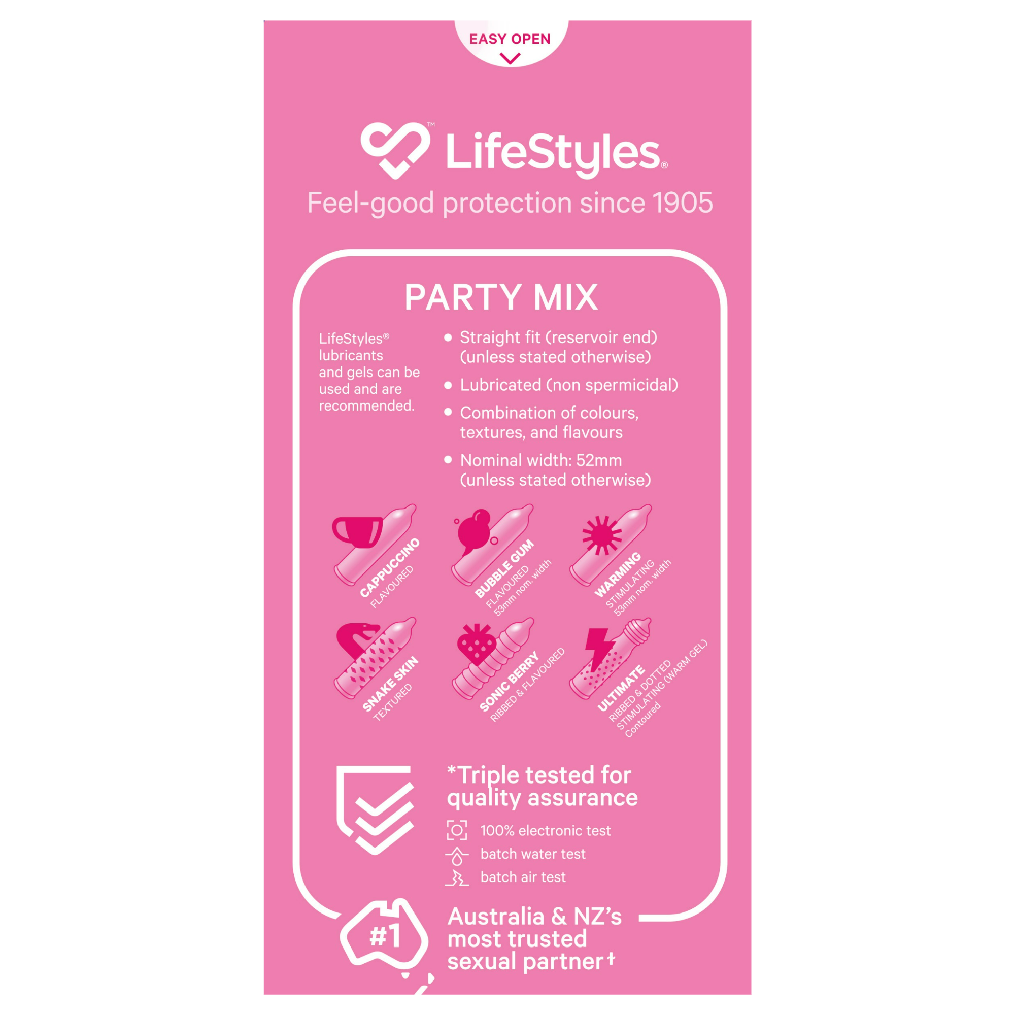 LifeStyles® Party Mix condoms contain a variety of fun colours, textures, and flavours.